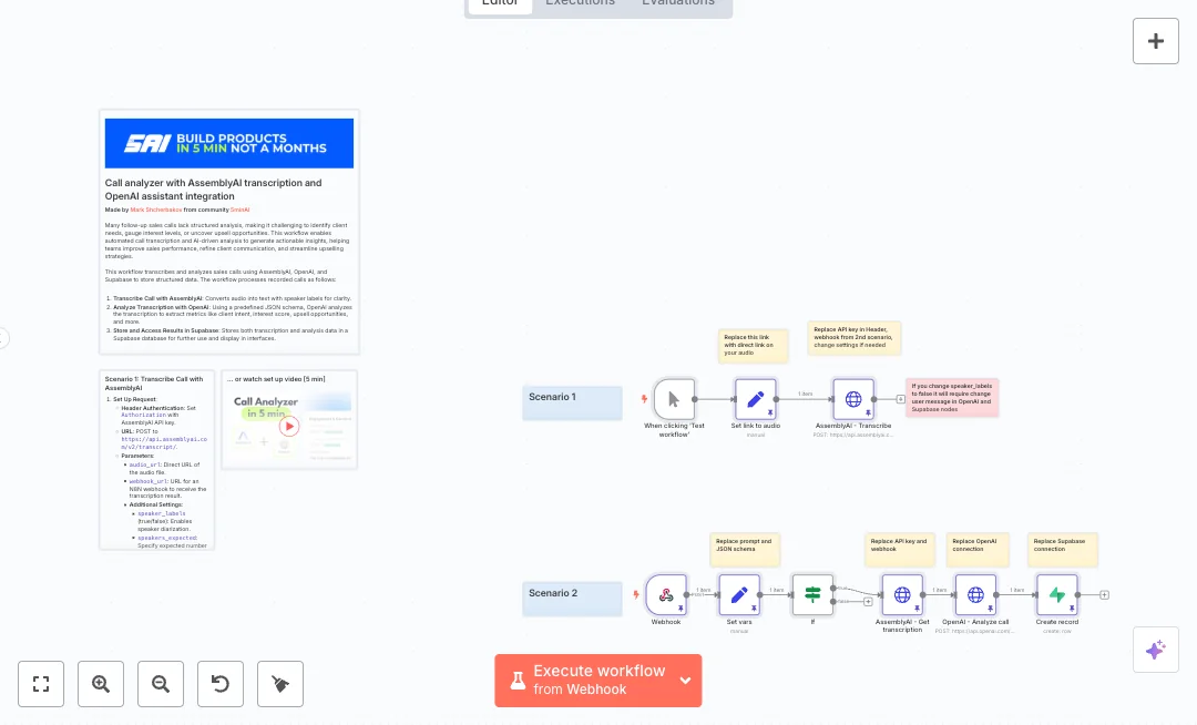 Setup needs API keys for the transcription tool, the AI model, and your database project. Replace the audio link, set your webhook URL, and adjust the prompt and schema to match your sales criteria. Expect a big drop in review time and faster coaching loops. Ideal for outbound call reviews, discovery calls, and tracking upsell opportunities at scale.