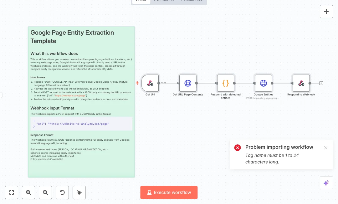 You need a Google Cloud API key with the Natural Language API enabled. Activate the workflow and send a simple JSON body with the URL to the webhook. Expect faster audits and fewer manual hours per page. Common uses include competitor page scans, PR list building, and tagging content for internal search.