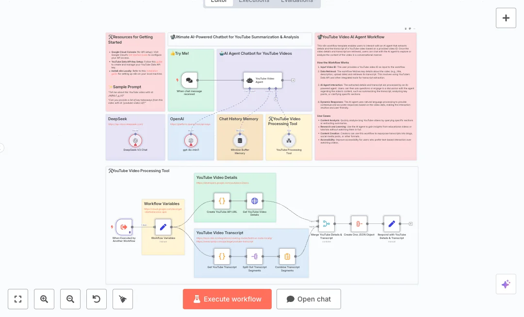 Behind the scenes, a chat trigger starts a conversation and keeps history so the AI remembers context. A custom tool builds a YouTube Data API request and pulls title, description, and publish date. Code also collects the video transcript, splits it into parts, and combines it into one clean text block. The workflow then merges details and transcript into one JSON object. An AI agent powered by an OpenAI model reads this data and answers questions, summarizes content, and points to key moments.
