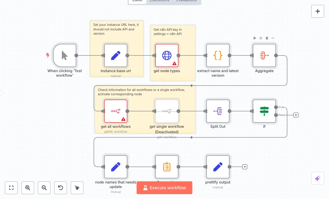 The run starts with a manual trigger. A Set node stores your base URL, then an HTTP Request pulls the official list of node types and their latest versions from your n8n API. A Code node extracts the name and latest version for easy matching. The n8n API nodes fetch either all workflows or a single workflow based on what you enable. Split Out iterates every node in each workflow. An If check marks nodes that do not match the latest version list. Results are collected with a Set node, grouped by workflow with Summarize, and formatted with a final Set node for a clean report.