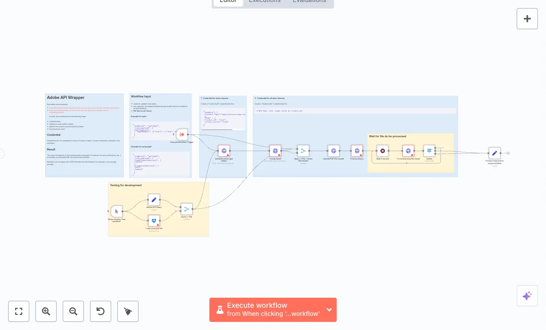 The flow can start from a manual test or be called by another workflow. It requests an access token from Adobe, creates an asset, uploads the PDF, and builds a request based on the chosen endpoint and JSON payload. It then waits for a short time, checks the job status, and keeps polling until the file is ready. A Switch node routes success or in progress states. A Dropbox node is included to load a test file, but you can pass a binary PDF from any source.