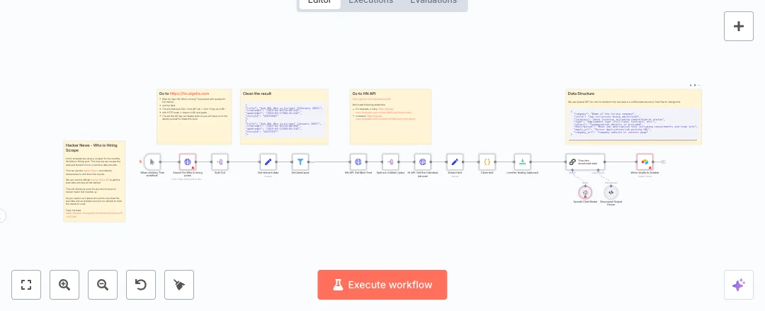The setup starts on click, searches the Hacker News index on Algolia for the monthly Who is hiring post, and keeps only the newest thread. It pulls the main post from the Hacker News API, splits all comment IDs, then requests each comment to collect the job text. A Code step cleans the content and an optional Limit keeps tests fast. OpenAI converts the free text into a standard JSON format with fields like company, title, location, type, salary, description, apply URL, and company URL. The results go straight to Airtable as rows you can filter, sort, and share.