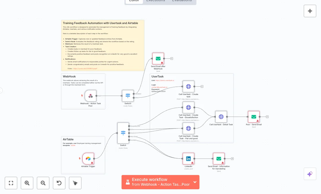Setup needs an Airtable base for feedback, a Usertask API key and client ID, LinkedIn company access, and an SMTP sender. Expect faster handling of poor scores, less manual sorting, and public praise for strong results. Use it for employee training, onboarding classes, and partner workshops. Adjust the Switch conditions to match your rating scale and update the callback URL to your n8n webhook.