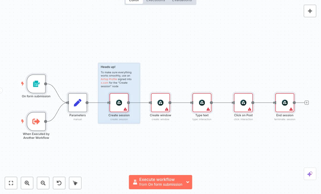 A form collects the Airtop profile name and the text to publish. The values are mapped and sent to Airtop, which opens a browser session with that profile, visits x.com, types the message in the What’s happening box, and clicks Post. The session then closes and saves the profile. You can also trigger the same steps from another workflow by passing airtop_profile and post_text.