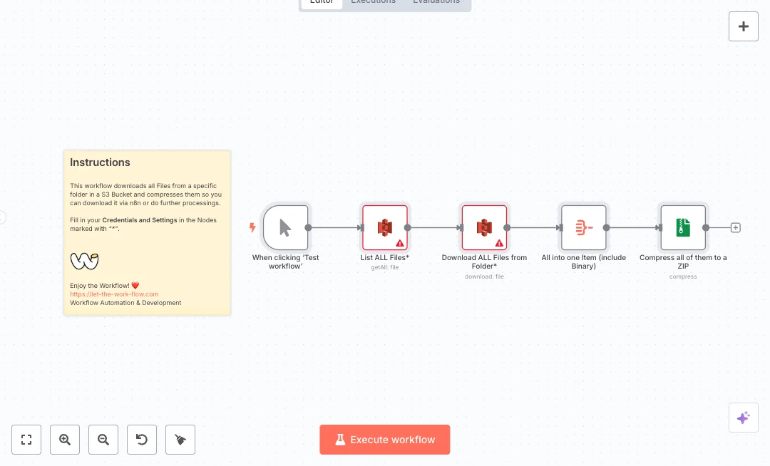 You start it with a manual run. First it lists all objects in the target S3 folder, then downloads each file. Next it combines the results so all files sit together, and finally it compresses them into one zip you can download. The flow uses Amazon S3 for storage and simple n8n steps for merge and compression. Because it reads the folder directly, nothing gets skipped or renamed by hand. The combine step also includes the actual file data, so the zip picks up every file automatically.