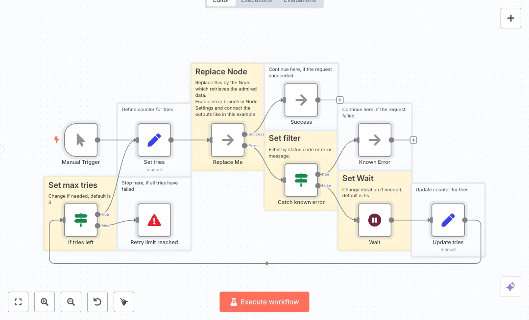 Setup is simple. Swap the placeholder step with your API node and turn on the error output. Set max tries and the wait time. Define the filter so known errors can go to a separate path. Expect fewer manual restarts, faster recovery from outages, and cleaner logs. Use it for handling rate limits, short outages, or slow endpoints without babysitting every run.