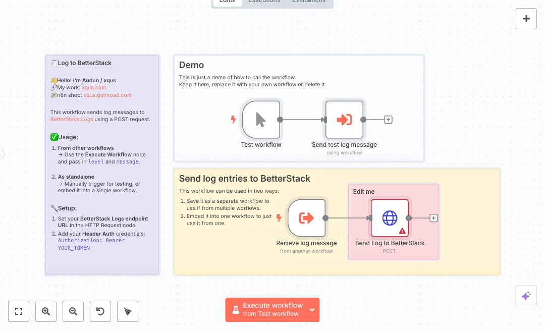 Under the hood, an Execute Workflow Trigger accepts two inputs called level and message. Any other workflow can call it with an Execute Workflow node and pass those two fields. The HTTP Request node then sends a POST request with a JSON body to your Better Stack Logs endpoint using header based auth. A Manual Trigger with a built in test sender is included so you can verify everything before connecting other flows.