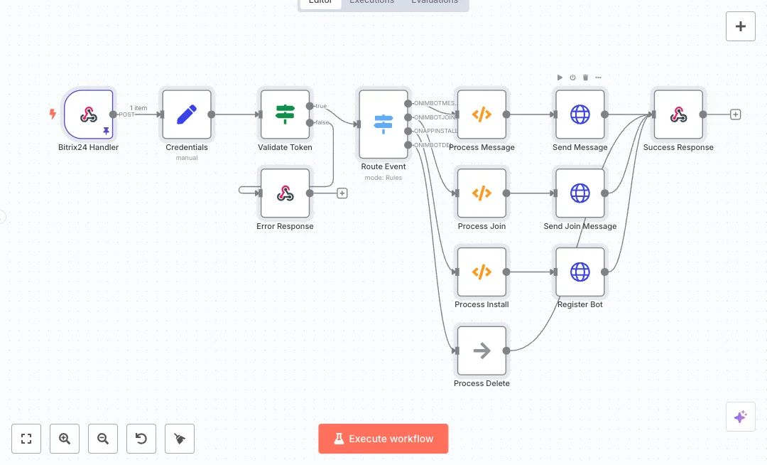 A webhook catches Bitrix24 events and checks a shared token for security. Events are routed by type to the right handler: message received, member joined, or app installed. Each handler prepares clean data and calls Bitrix24 to send a reply or welcome message. On install, it registers the bot and sets callback URLs. Clear success and error responses return the right status to Bitrix24, which keeps the chat flow stable.