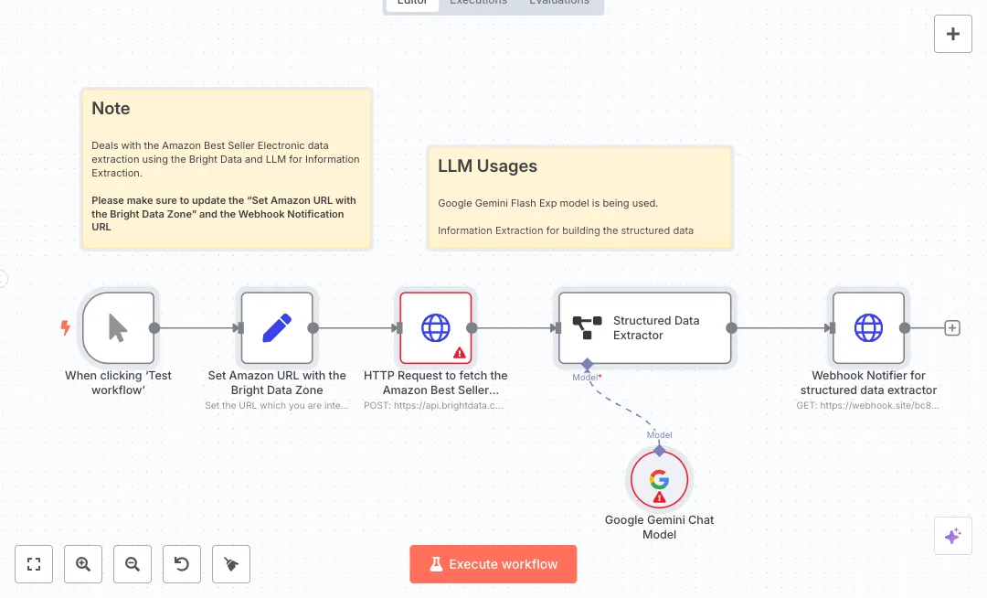 The run starts with a manual test. A Set node lets you choose the Amazon category URL and your Bright Data zone. An HTTP Request calls Bright Data to fetch the raw page. A Structured Data Extractor uses the Google Gemini Flash Exp model to read the text and fill a custom schema for items like title, brand, price, rating, rank, and category. The final JSON is posted to a webhook endpoint for easy handoff and review.