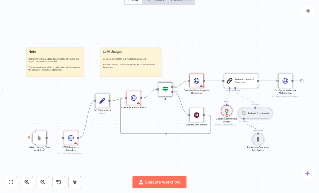 A manual start kicks off a Bright Data dataset run and returns a snapshot id. The flow checks the snapshot status in a loop, waits 30 seconds if it is not ready, and tries again until data is complete. When ready, it downloads the JSON. The text is split into smaller parts and loaded into the AI summarization chain. Google Gemini creates a short, readable brief. The summary is then sent to your webhook endpoint for easy handoff to reports or dashboards.