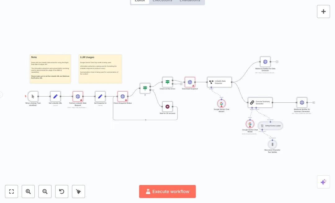 The flow starts on click. A LinkedIn URL is set, then a Bright Data job is triggered to scrape the page. The workflow checks job status in a loop and waits between checks. When the snapshot is ready, it downloads the data in JSON. An AI extractor shapes the content into a readable story using Google Gemini. A summarization chain then produces a concise version. The system posts both outputs to your webhook. Extra nodes handle long text by splitting it into chunks, and If nodes check for errors before moving on.