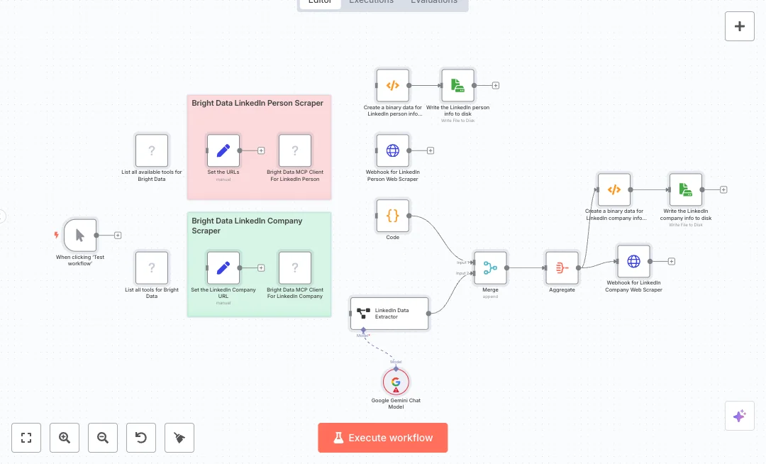 The run starts on click, pulls a person profile and a company page through Bright Data tools, and returns clean text. An AI step powered by Google Gemini turns the company info into a JSON story. The flow merges company About details with the AI story, posts the result to a webhook, and writes both person and company JSON files to disk. Code, Merge, and Aggregate nodes keep the data tidy. Tool discovery nodes check available Bright Data tools before calls.