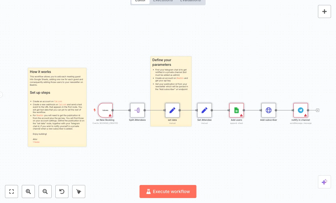 Set the Beehiiv API key, publication ID, and Telegram chat ID in the data node, and connect your Google Sheets and Cal.com accounts. Expect faster follow up, cleaner records, and steady list growth without manual copy and paste. Ideal for demo calls, coaching sessions, and webinar bookings where every attendee should get your newsletter.