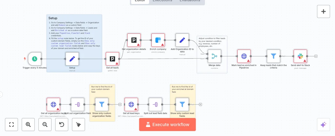 The schedule runs a Pipedrive lead pull for not archived records. For each lead, the related organization is fetched, the domain custom field is read, and Clearbit adds firmographic data like employees and revenue. Enriched data is merged back using the organization id, then a custom date field marks the lead as enriched. A filter keeps only leads that meet your rules, and a Slack message sends company name, website, revenue, and headcount to the channel set in the Setup node. Helper nodes list Pipedrive field keys so you can copy the IDs for the domain and enriched at fields.