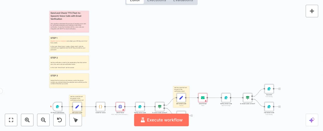 A hosted form collects the phone, email, name, and preferred voice. A set node creates a voice code, a small code step adds spaces so text to speech reads each digit clearly, and an HTTP request posts to ClickSend to place the call that speaks the code. The user enters the code on a verify page, and an if check allows the next stage only when the code is correct. After the voice check passes, the flow sends a second code by SMTP email, shows a new verify page, and routes to success or fail based on the match.