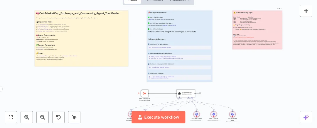 It is called by another workflow and accepts a message and a sessionId. An AI agent with memory chooses from five CoinMarketCap tools to fetch the right data. It maps an exchange slug to an id, then pulls profile details or asset holdings. It can also return the latest CMC 100 index and the fear and greed score. All results come back as structured JSON for direct use in apps or reports.