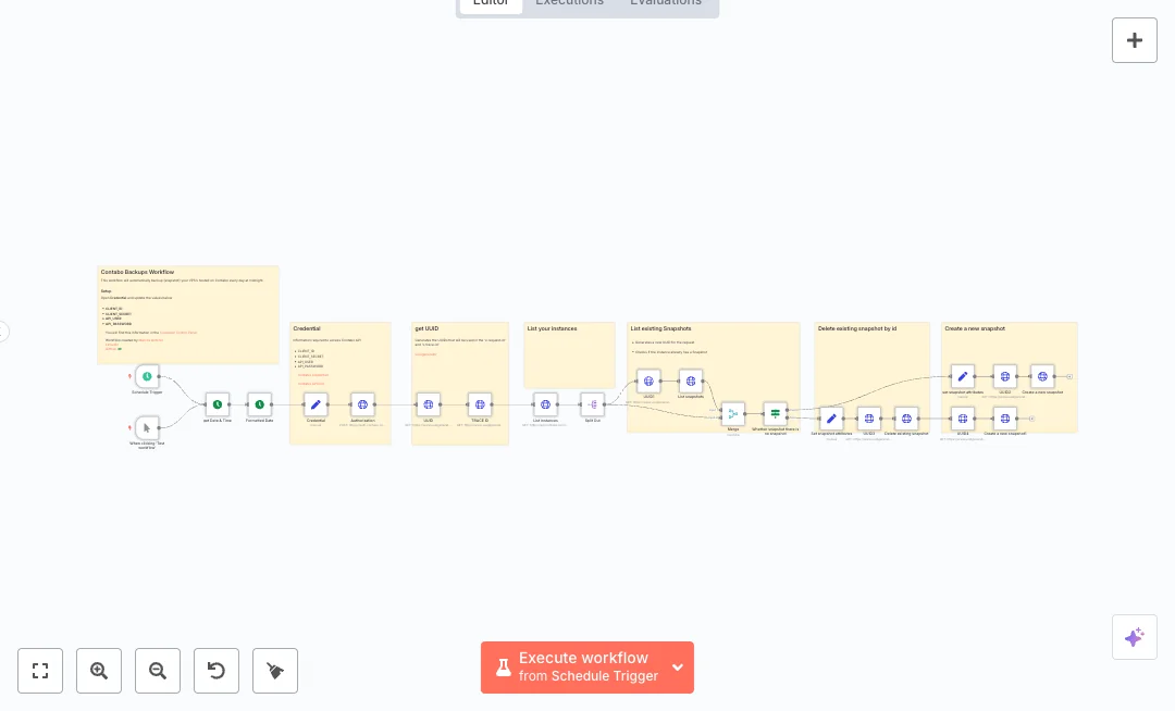 On a schedule or on demand, it pulls the current time and formats a clean date stamp. It exchanges your Contabo client and user credentials for an access token, then lists all instances and processes each one. Unique request and trace IDs are generated for every API call to improve auditing. For each server it checks for an existing snapshot, deletes it if found, and creates a new snapshot named with the current date.