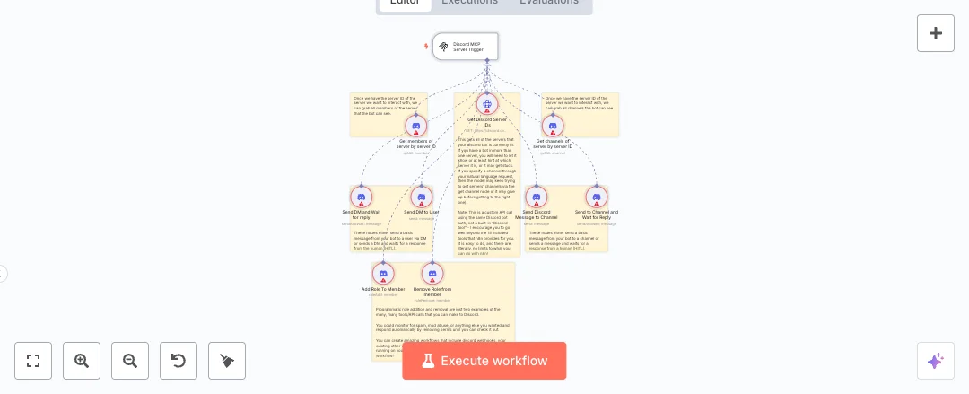 An MCP server trigger exposes a set of Discord tools your agent or chat UI can call on demand. The workflow uses a Discord bot to list servers, then fetch channels and members for a selected server. It can send a message to a channel and wait for a human reply, or DM a user and pause until they answer. It also adds or removes roles programmatically. With these actions, teams can run surveys, qualify members, and grant access based on responses, all from one place.