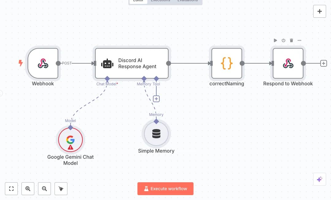 A webhook receives a POST from your Discord bot with the userId, userName, and question. The flow sends the text to a Google Gemini chat model and keeps a short memory window per user so replies stay on topic across messages. An agent shapes the response using system rules, and a code step cleans the output. The workflow returns the final text through the webhook so your bot can post it back in Discord.