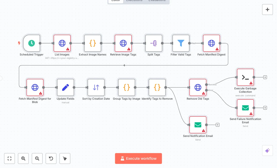 Each night the schedule starts at 1 AM. The flow lists all repositories from the registry catalog, then loads tags for every image. It splits and filters tags, sorts by creation time, and groups tags by image. It fetches manifest digests and deletes only the tags that do not match your rules, like keeping latest and the most recent builds. After deletions, it connects over SSH to run the garbage collection command on the host. Email notices confirm removals, and a separate email reports any failure. It supports Docker and OCI image formats using proper Accept headers.