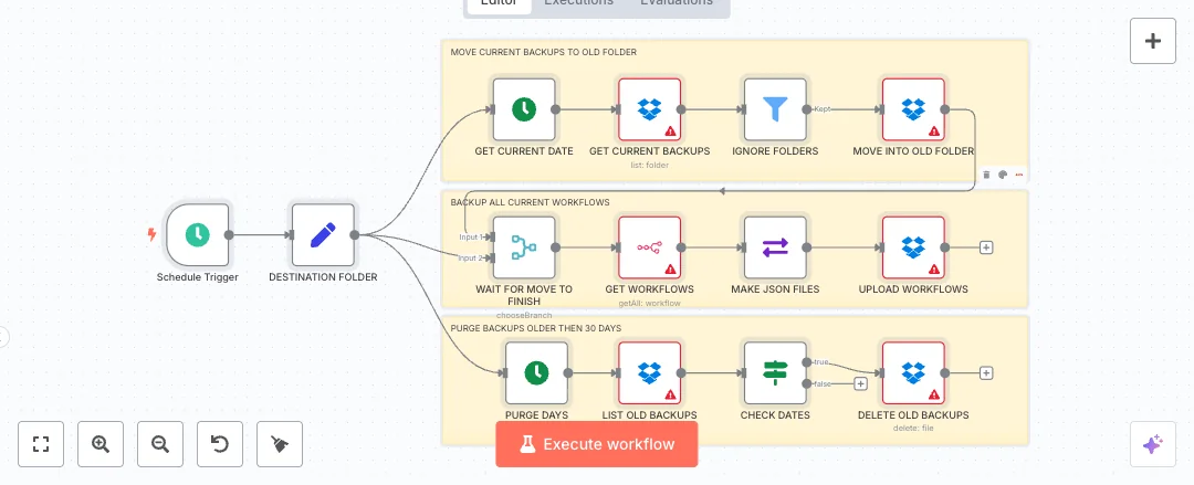 Keep your n8n work safe with automatic backups to Dropbox. The flow runs on a schedule, saves fresh copies of all workflows, and clears files older than 30 days. It suits ops and IT teams that need hands free version history and quick restore points.
