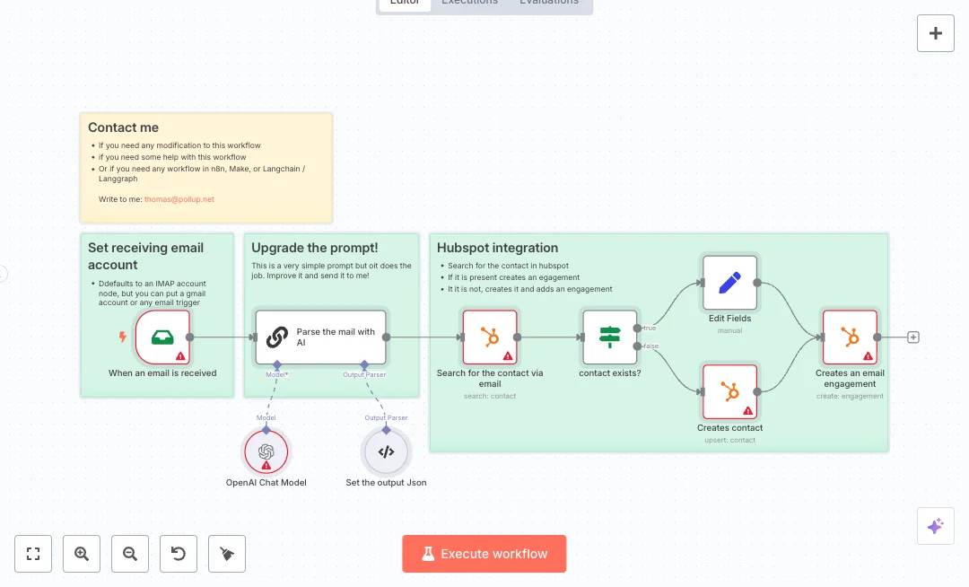 An email inbox watched by IMAP receives a new message. An AI model reads the email and pulls key details like name, email, phone, company, and location into a structured JSON. The flow checks HubSpot for a matching contact by email. If found, it maps the HubSpot contact id and records the email as an engagement. If not found, it creates the contact first, then adds the engagement with the original subject and body. The setup uses an OpenAI chat model with a defined output schema to keep fields consistent.