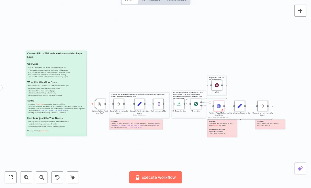 The flow starts with a manual test run. URLs come from an example array or your own database under a field named Page. The list is split so each URL is handled on its own. A limit of 40 items controls memory use. Batches of 10 go to the Firecrawl API through an HTTP Request, which returns markdown, page metadata, and links. A short wait of 45 seconds is used to respect 10 requests per minute. The mapped fields are prepared so you can write the results into your system of record.