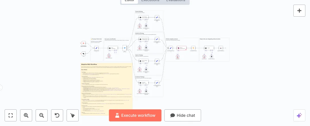 A chat event or another workflow starts the run. A Google Gemini agent labels the question as factual, analytical, opinion, or contextual. A Switch node then sends it to a matching strategy that tightens the query, breaks it into sub questions, maps perspectives, or adds user context. The system searches a Qdrant collection using Gemini embeddings. It builds a clean context block, then a final Gemini agent uses that context, the user question, and shared chat history to draft the answer, which returns by webhook.