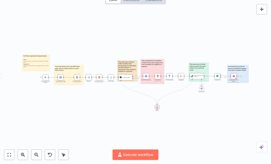 Here is how it runs. A manual trigger starts a fetch of the news page, then HTML nodes extract article cards, titles, links, and short descriptions. Items split out and a limit node caps volume. A Gemini based classifier scores each headline to decide if it fits a podcast. Only suitable items move on. The workflow fetches each full article page, extracts the body, removes empty results, and aggregates the text. A Gemini LLM then turns the set of stories into a structured podcast script using an output parser. If a script exists, a Hugging Face text to speech node generates the audio file.