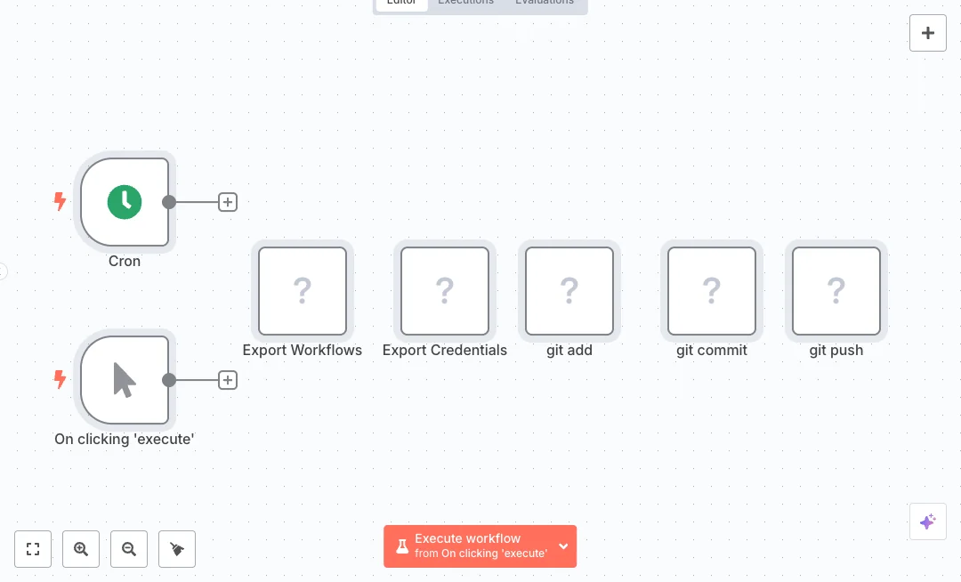 Two triggers kick things off. A schedule runs at midnight, 6 am, noon, and 6 pm, and there is also a manual start button when you want an instant backup. The flow first exports all workflows to a folder named repo/workflows. It then exports all credentials to repo/credentials. Next it stages the files, creates a commit with a timestamp in the message, and pushes to your remote repository. Everything runs with simple command steps, so you get a clean version trail without extra apps.