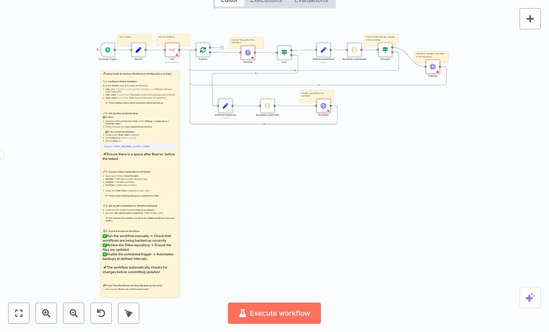 Setup needs a Gitea personal access token and an n8n API credential. Enter the repo details in the Globals node, then connect the credentials to the three Gitea request nodes. Run a test and confirm files appear and update as you change flows. Expect less manual work, clear history, and faster recovery after mistakes. Great for IT teams, platform owners, and any group that must track automation changes.