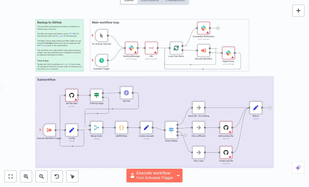 Keep your n8n workflows safe and easy to track by backing them up to GitHub on a set schedule. You also get clear Slack updates when a run starts, finishes, or hits a problem. This is ideal for teams that want version control, change history, and a simple recovery path.