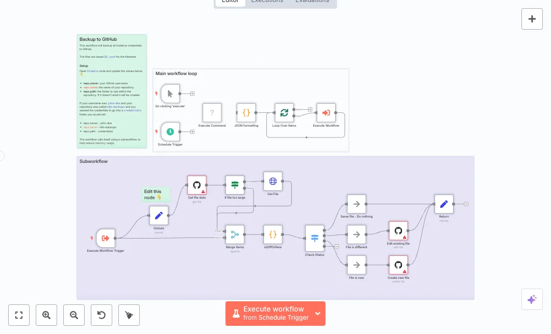 It can run every two hours or on demand. A command exports all credentials, a formatter cleans the JSON, and a batch loop processes items one by one using a subworkflow to keep memory use low. For each credential, the system pulls the current file from GitHub. If the file is large, it downloads it via the direct link, then a code step compares sorted JSON to decide same, different, or new. A switch then creates a new file or edits an existing one with a clear commit message. If nothing changed, it skips the write to save time and API calls. Files use the credential id as ID.json inside your chosen repo path.