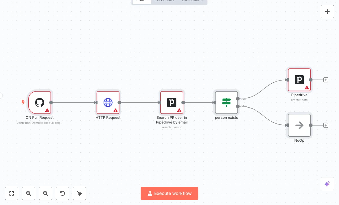 A GitHub event starts the flow when a pull request is opened. The workflow calls the GitHub API to fetch the sender profile and uses the email to search for a person in Pipedrive. If a match is found, it writes a note on that person with the pull request link. If no match is found, it does nothing. This links product usage to the CRM record so reps can see engagement history next to deals and activities.