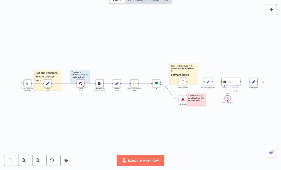The flow pulls a selected file from a GitHub repo, reads the text, finds all placeholders inside double braces, and checks if every required variable is set. If anything is missing, it stops and shows which keys you need. When all keys are present, it replaces the variables, builds the final prompt, and sends it to an AI agent powered by an Ollama chat model. The response is captured as a clean field you can pass to other steps or export. This design keeps prompts organized, prevents broken runs, and makes content generation repeatable at scale.