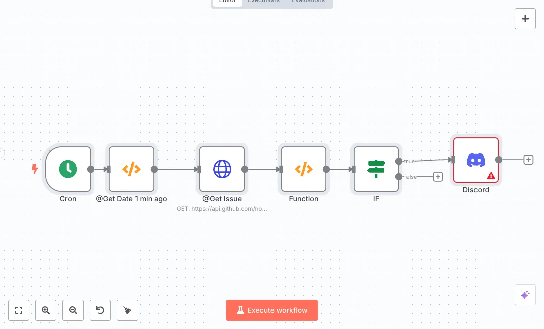 A schedule runs every minute. A small script calculates the time one minute ago and passes it to the GitHub notifications API. The request uses Basic Auth and a User Agent, and only asks for updates since the last minute to cut noise. Another script turns each notification into a short line with reason, title, and a readable link. A check step only sends to Discord when there is something new, then the message tags a user so the right person sees it.
