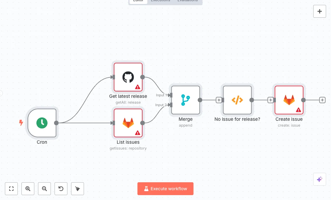 Stay on top of upstream changes without manual checks. When a new release appears on GitHub, the flow looks for a matching issue in GitLab and opens one only if it does not exist. Great for teams that maintain Docker images, libraries, or internal forks and want clear follow up work.