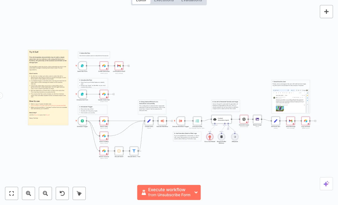 Each morning at 9am, a schedule checks Airtable for active subscribers in daily, weekly, and surprise segments. It spins each subscriber into a separate subworkflow so one failure does not stop the rest. A chat model creates a short fact using Wikipedia as a source. OpenAI generates an image, the image is resized, and Gmail sends the email. After the send, the workflow updates Last Sent in Airtable and stores execution data so you can filter logs.