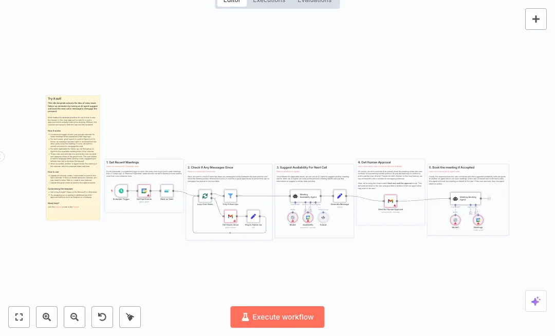 Every morning a schedule runs. It pulls Google Calendar events from two to four days ago and removes duplicates so the same meeting is not processed twice. For each event, Gmail search checks if any message has been sent or received with the attendee since the meeting ended. If nothing is found, the flow marks that lead for follow up. An AI agent reviews the prior meeting details and your live calendar availability to suggest time slots. A clear message is then prepared and sent to you using send and wait for approval. You reply in plain language to accept, change, or decline. If approved, another AI agent books the new meeting on your calendar.