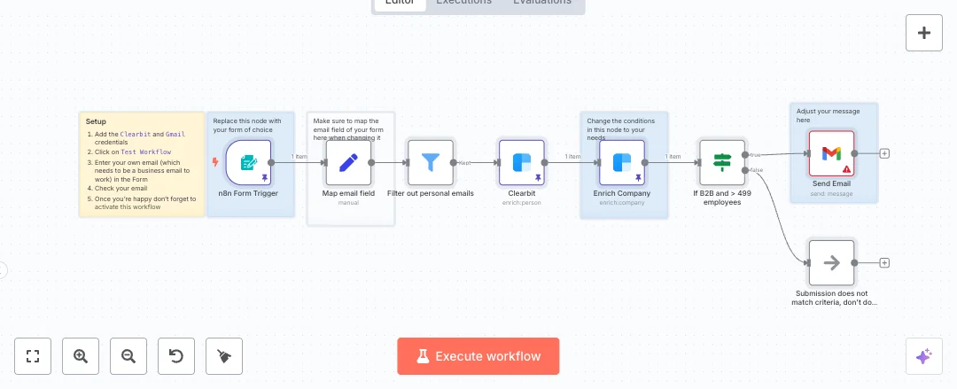 You will need a Clearbit API key and a Gmail account connected in n8n Cloud. Adjust the filter list and the employee threshold to match your ideal customer profile. Edit the email copy to match your brand. Expect faster replies, fewer low value leads, and more time focused on accounts that matter. Great for B2B SaaS forms, agencies working with larger firms, and teams that want to qualify leads before a reply.