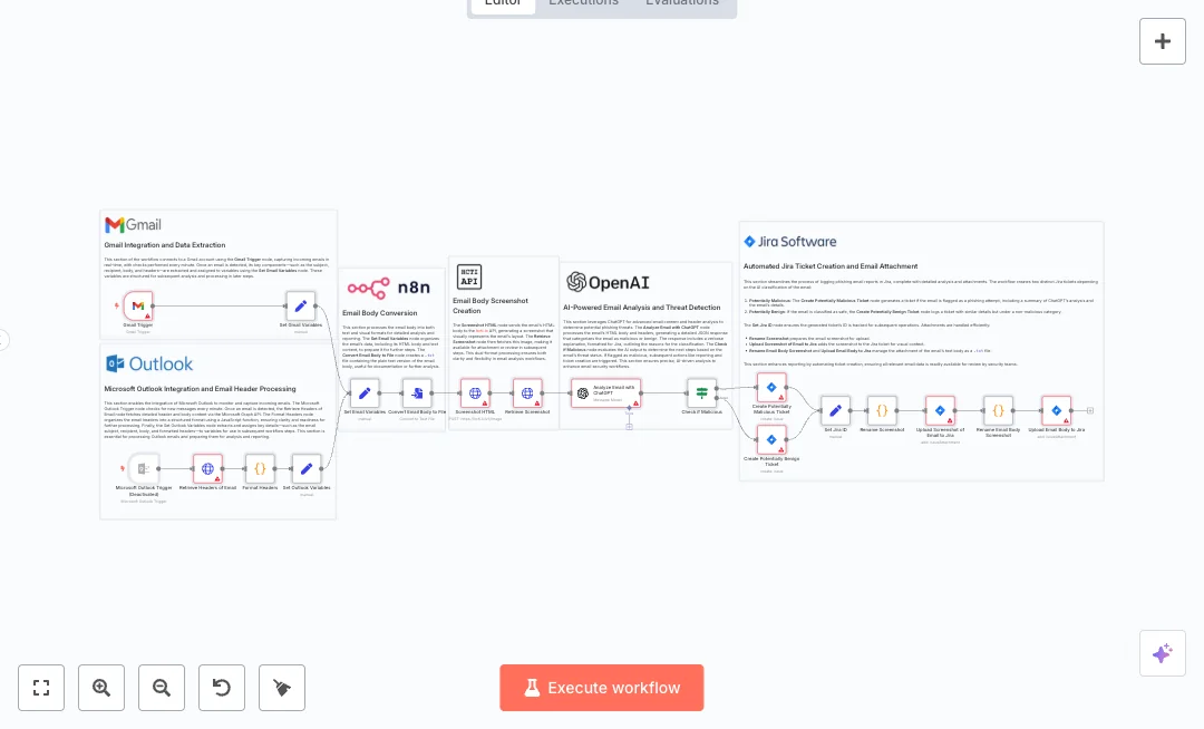 New emails arrive through Gmail Trigger and Microsoft Outlook Trigger every minute. Outlook headers and body are pulled from Microsoft Graph and formatted, while Gmail details are mapped to the same fields. The flow standardizes the data, turns the HTML into a text file and a full screenshot using HTML CSS to Image, then sends the body and headers to OpenAI for scoring. A check node routes the result to either a malicious or benign Jira ticket, and both the screenshot and the text file are attached automatically with the ticket ID tracked for uploads.