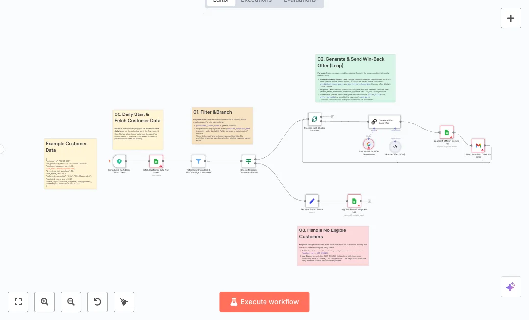 Bring at risk customers back without manual work. This setup checks your customer sheet every day, finds people likely to churn, and emails a tailored offer that fits their interests. It suits retention and growth teams that want daily action from simple data.