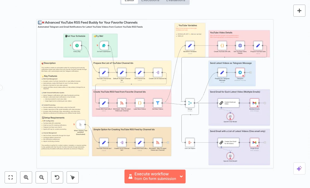 Set your Google API key in the variables node, connect Telegram and Gmail, and pick a daily schedule that fits your team. Expect to replace manual channel checks that take about an hour with a simple review that takes minutes, while making sure new uploads never slip through. Ideal for campaign monitoring, content curation, creator relations, and executive updates.