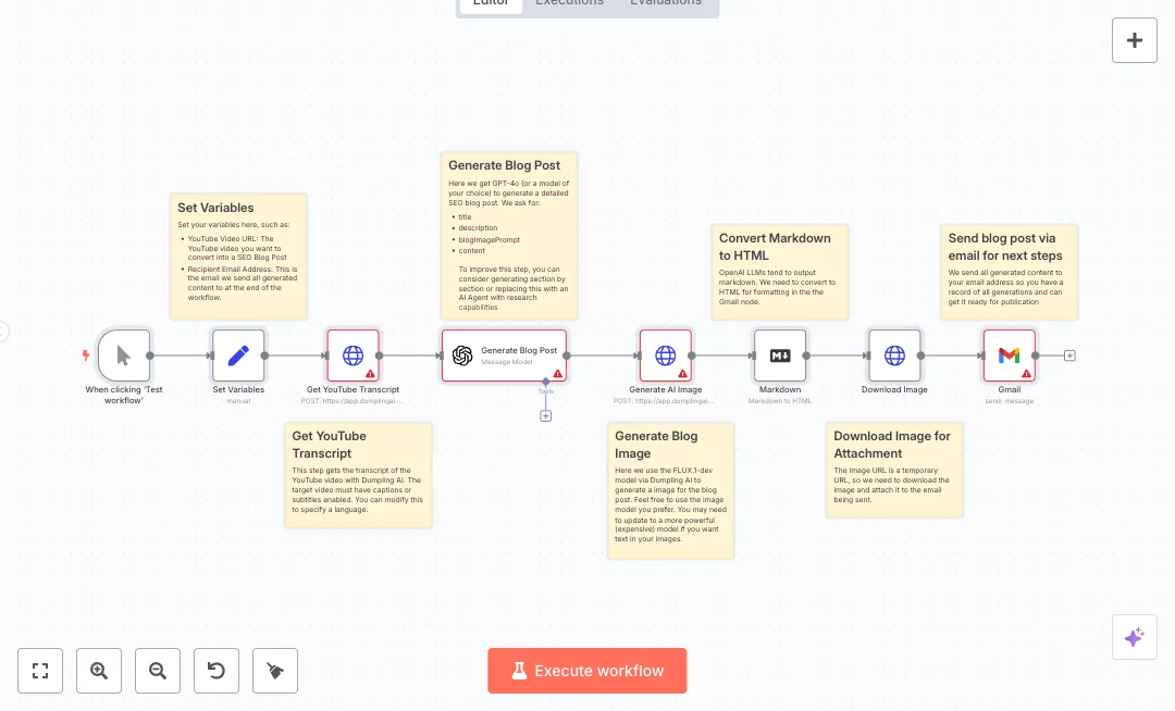 Make sure the video has captions enabled and connect your OpenAI, Dumpling AI, and Gmail accounts. Expect faster post production and a steady flow of blog drafts for websites and newsletters. Helpful for YouTube channels, agencies, and solo creators who repurpose videos into written content.