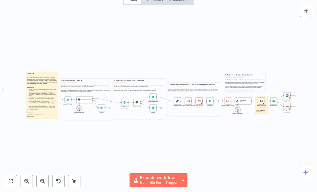 You need Gmail, Google Calendar, and OpenAI accounts. Set the admin email in the Gmail wait for approval node and choose your target calendar. Expect fewer back and forth emails and less time spent on manual triage. Agencies, consultants, and sales teams can screen requests, keep the form experience smooth, and schedule confirmed meetings with confidence.