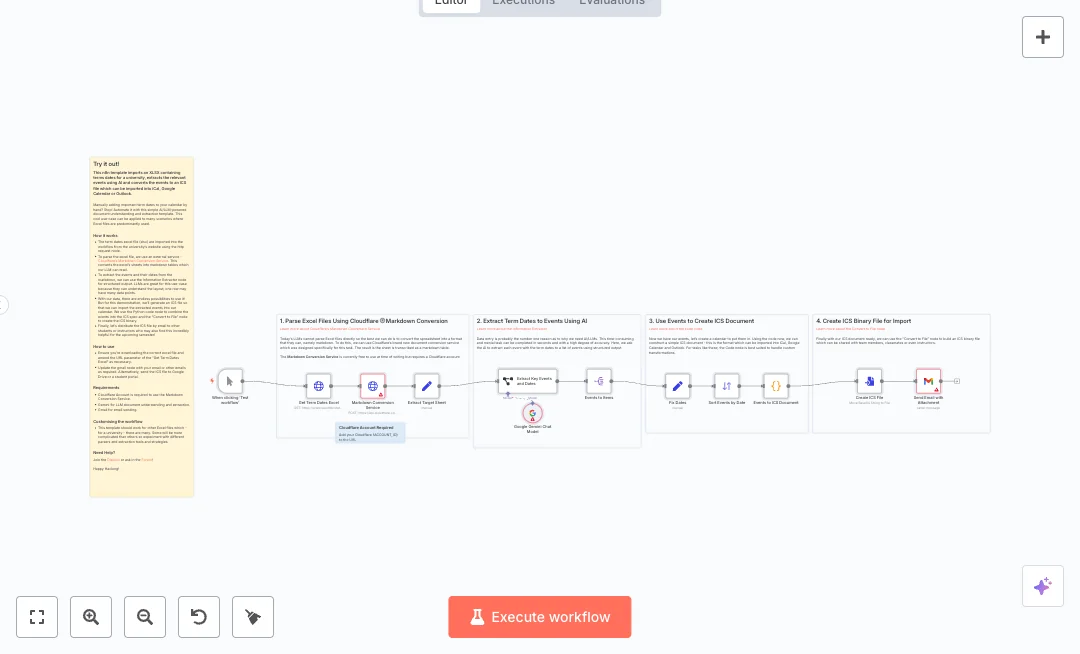 You will need accounts for Cloudflare, Google Gemini, and Gmail. Replace the Cloudflare account ID in the URL and add credentials for each node. Point the download node to your own spreadsheet. Expect to cut hours of entry down to minutes and avoid date mistakes. Use it for academic terms, training cohorts, or company events. After a test run, import the ICS into Google Calendar, Outlook, or Apple Calendar and share it with your team.