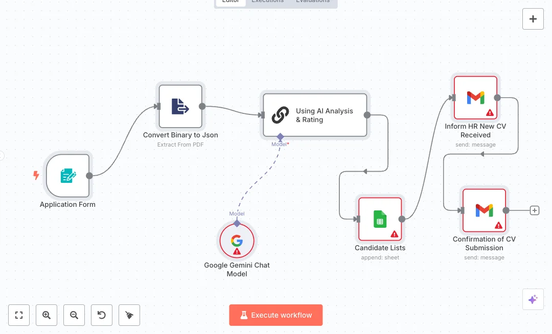 You will need Gmail, Google Sheets, and access to the Google Gemini API. Map your form fields to the sheet columns and confirm the file field name matches the PDF extractor setting. Most teams cut resume review time from hours to minutes and keep a clean candidate list. Useful for tech roles, interns, or any role where many resumes arrive daily.