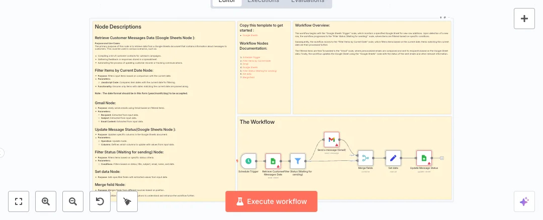 A schedule runs every minute and pulls rows from a Google Sheet. A filter lets through only records with Status set to Waiting for sending and a date that matches today in year month day format. Gmail then sends each message using the sheet fields, with Title as the email subject and Subject as the email body. Results are merged back with the row data, needed fields are prepared, and the sheet is updated to mark Status as Sent successfully using the row ID. This creates a light email queue without manual copy and paste.