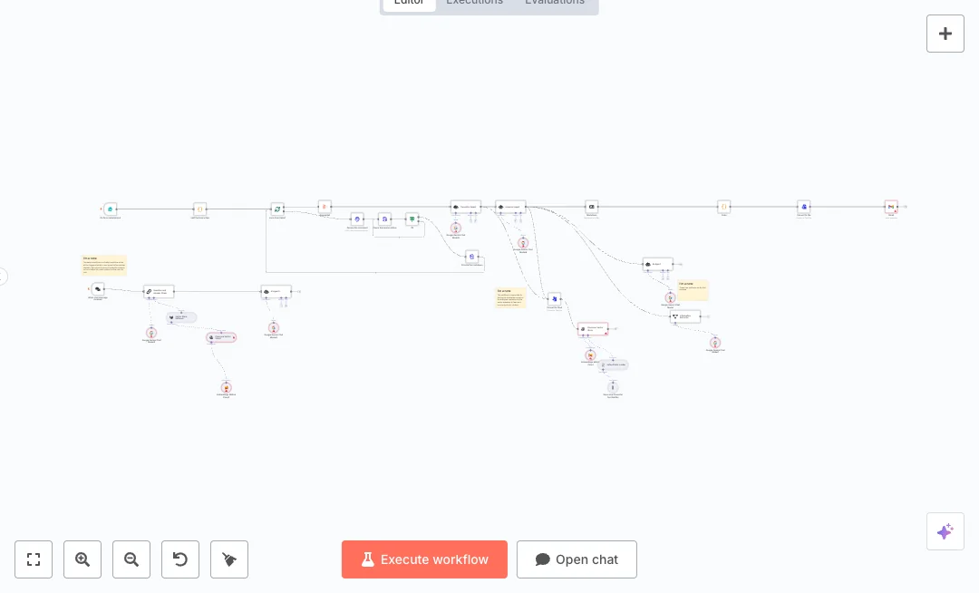 Incoming files arrive through a form. Each file is split and sent to a parsing API that turns it into markdown. The flow checks parsing status, pulls the result, and merges all markdown. An AI model translates and analyzes the content, then the text becomes HTML and a clean attachment. A copy is stored in a vector database using Mistral embeddings and Pinecone so the chat assistant can answer questions with context. A second trigger listens for chat messages and uses a retriever and Q and A chain with Gemini to reply based on the uploaded content. Gmail sends the report and link so the user can keep the conversation going.