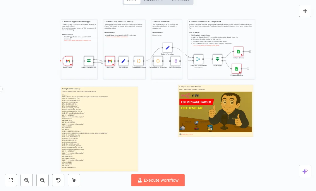 Setup needs Gmail and Google Sheets credentials in n8n. Send the sample EDI from the note to your inbox to test parsing and mapping. Expect big time savings on data entry, fewer copy paste errors, and quicker handoffs to picking and packing. Teams that receive orders by email can scale volume without adding headcount.